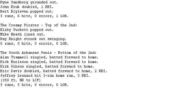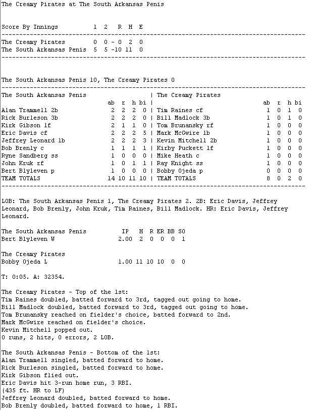 It didn't take long for The South Arkansas Penis to announce itself as a major force in the Fantasy RBI League. In the team's opening game of play on Monday before a packed house at Tengen Stadium, they humiliated a woeful Creamy Pirates team 10-0 in a game stopped in the second inning because of the 10-run mercy rule.