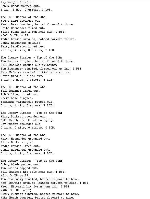 It would have been easy to predict a blowout in the Fantasy RBI League game between The OC and The Creamy Pirates on Monday afternoon at Tengen Field. After all, The OC are the defending World Series champions, while The Creamy Pirates were coming off of an embarrasing two-inning defeat in their opening game. However, The Creamy Pirates proved why games are simulated on the field, as they used a 10-run third inning to propel themselves to a shocking 20-7 victory in a game called after seven innings because of the mercy rule.