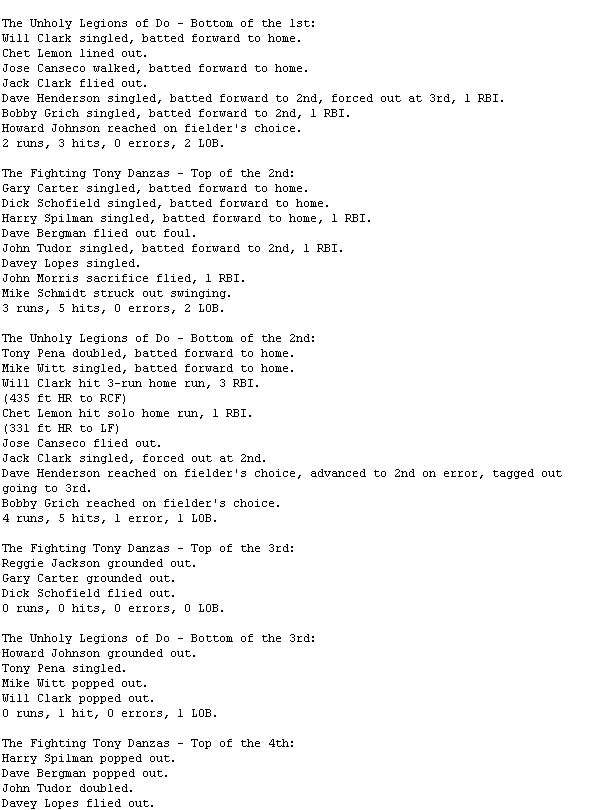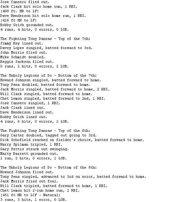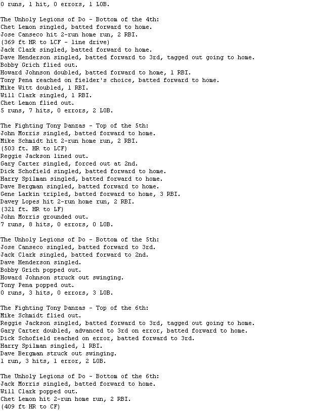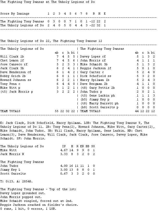 With The Unholy Legion of Doom's powerful line-up, it's not surprising that someone would hit three home runs in one game. What was surprising on Tuesday was that it was Chet Lemon who did it. Lemon's six RBI combined with Will Clark's five RBI provided plenty of offense as their team defeated The Fighting Tony Danzas 22-12 at Tengen Stadium in a Fantasy RBI League game called after eight innings because of the mercy rule.