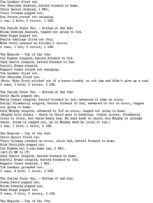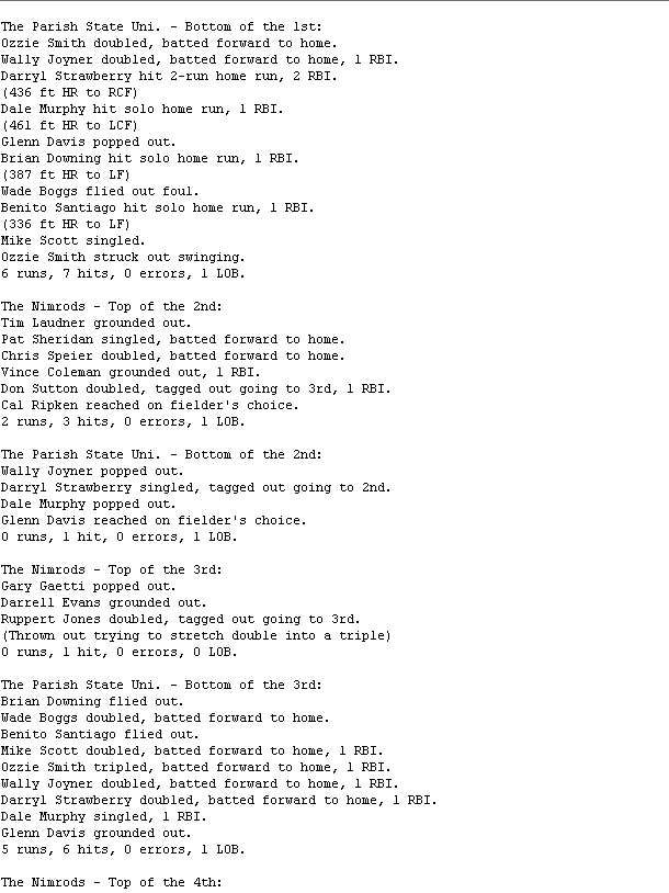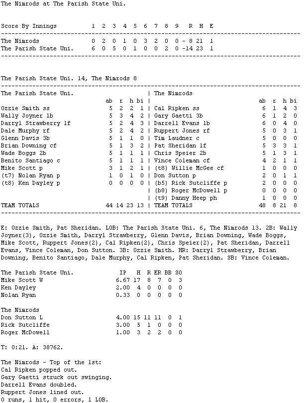 Darryl Strawberry, Dale Murphy and Wally Joyner each went 4 for 5 to pace a balanced Parish State (2-0) offense, which saw every starter score at least one run. Mike Scott pitched a gutty 6 2/3 innings to pick up the victory. Strawberry drove in three runs, while Joyner hit three doubles and scored three times.