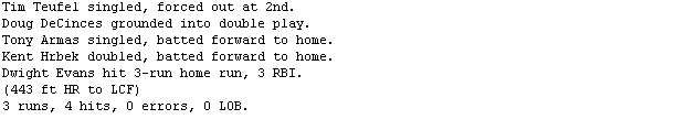 The OC (4-2) had jumped out to an early 2-0 behind a massive 613-ft HR by Andre Dawson. The blast sailed well above the scoreboard, and was perhaps the furthest hit ball in Fantasy RBI history.