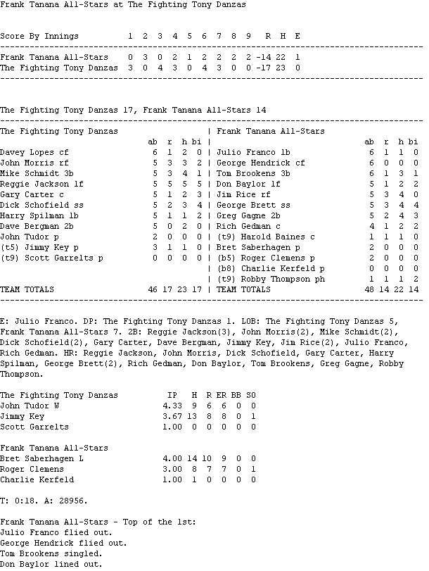 Jackson homered and also hit three doubles, while Dick Schofield homered and drove in four for The Fighting Tony Danzas (4-4), who have won three consecutive games. They jumped out to a 7-3 lead after three innings, and continually responded whenever The Frank Tanana All-Stars (6-2) would challenge their lead.