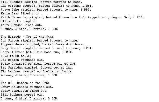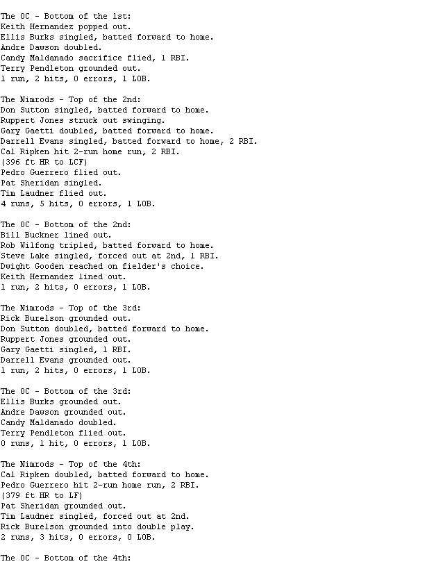Evans hit two and three-run homers for The Nimrods (3-5) and added a two-run single. Cal Ripken also hit two home runs, while Don Sutton picked up the win by scattering 10 hits over five innings.
