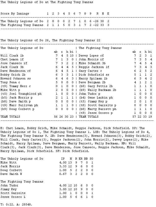 Will Clark provided The Unholy Legions of Doom (4-5) with the insurance runs they would need in the top of the ninth inning with a grand slam. It was Clark's third home run of the game and his season-leading 10th RBI.