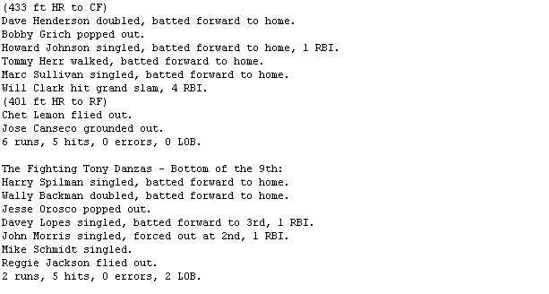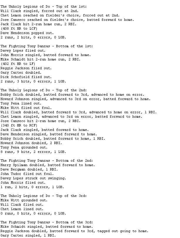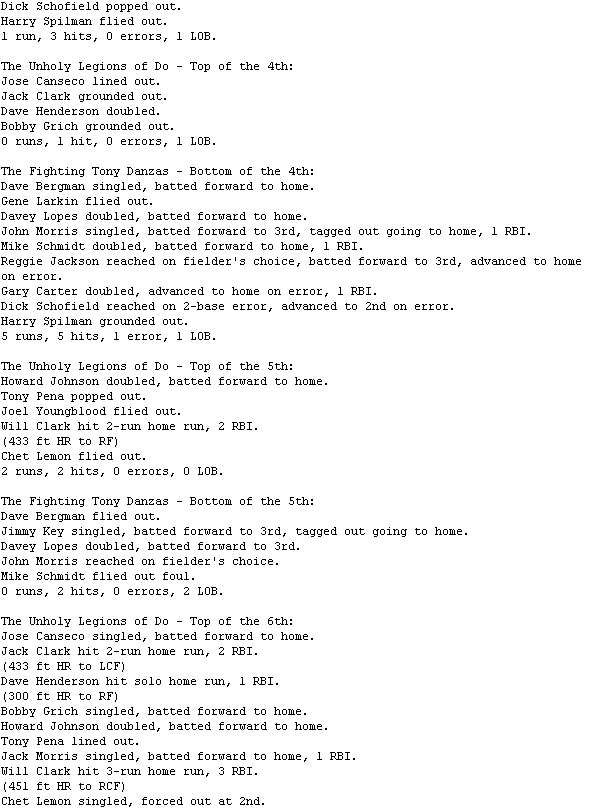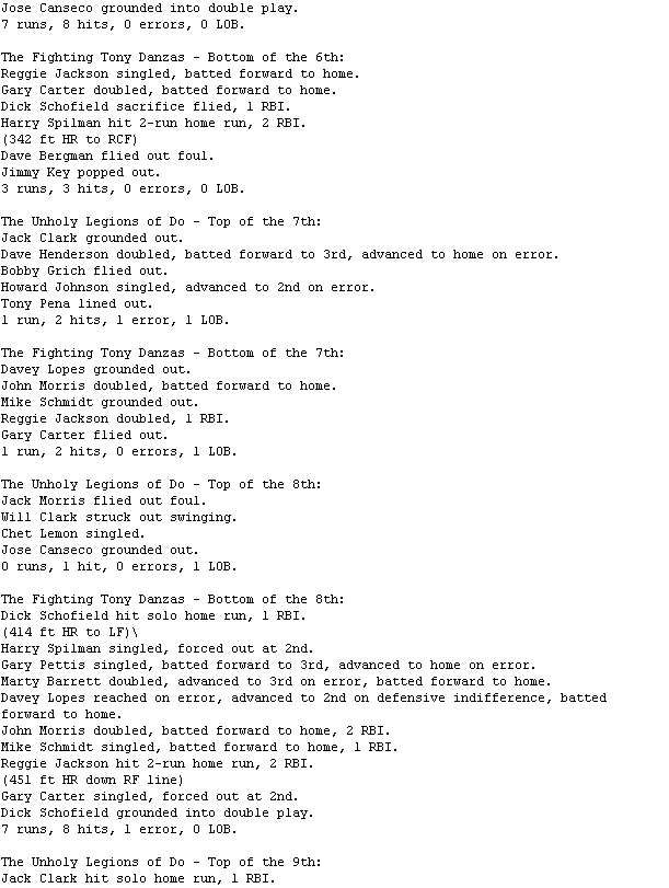 The Fighting Tony Danzas (4-5) tried to put together a ninth-inning rally, scoring twice and having the bases loaded with one out. But Mike Schmidt's single into right field turned out to do more harm than good. John Morris, who was on first before the hit, was forced out at second base on a bullet throw from Jose Canseco. From there, Doug Corbett was able to get Reggie Jackson to fly out to end the game.