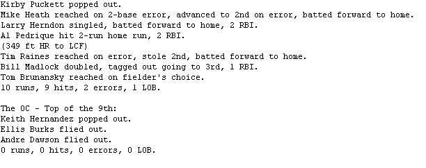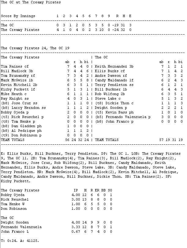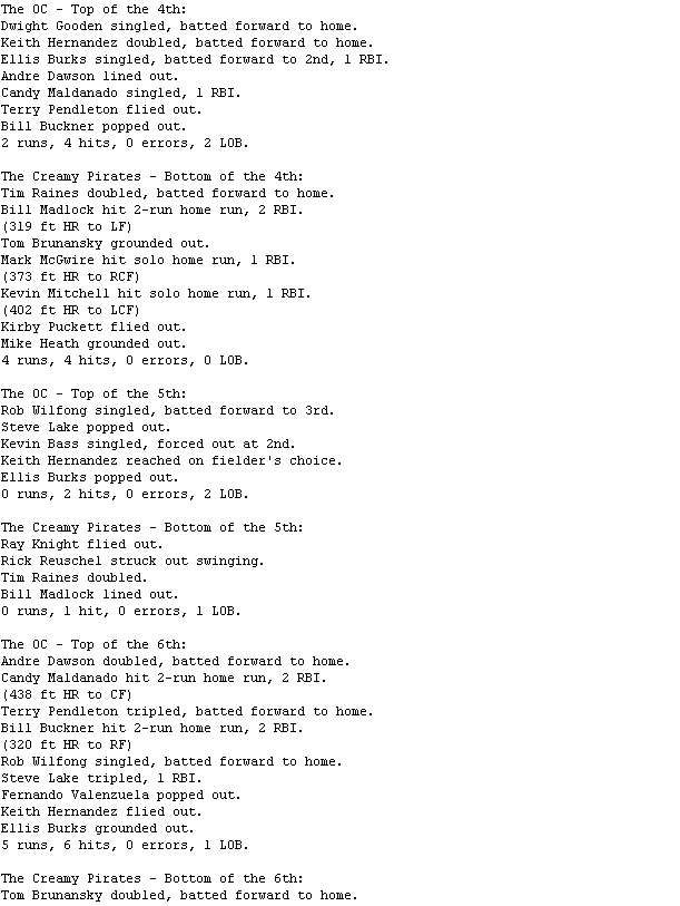 The OC (5-4) looked to have things in control after scoring 13 runs in the sixth through eighth innings. However, The Creamy Pirates unloaded on relievers Fernando Valenzuela and John Franco, with home runs from Madlock and pinch hitters Larry Herndon and Al Pedrique.
