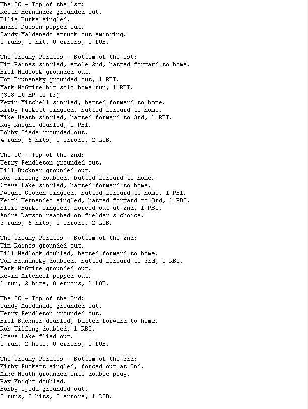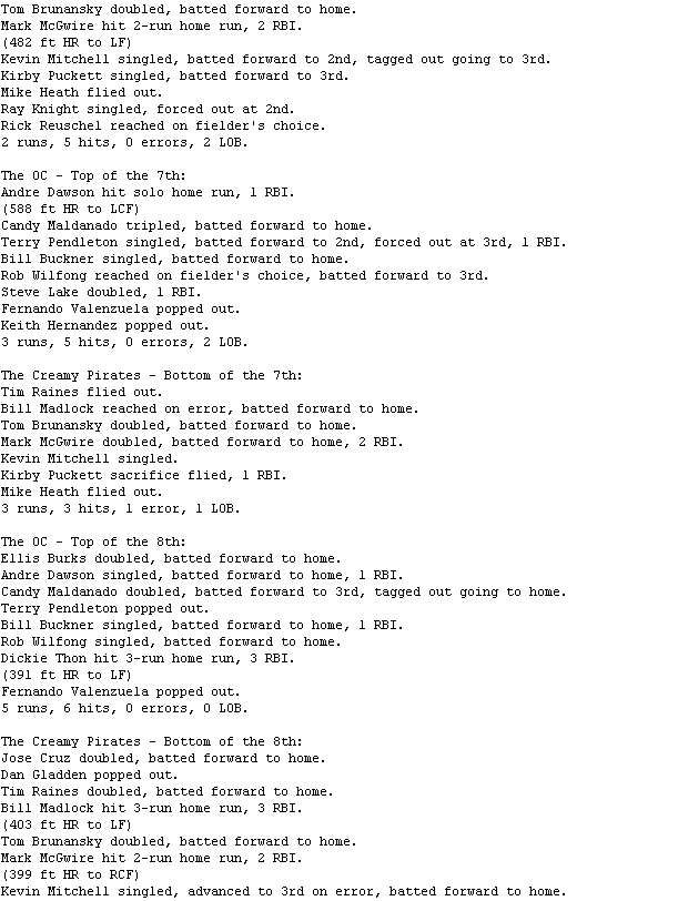Bill Madlock added two homers and six RBI for The Creamy Pirates (6-3), who swept the season series from the defending Fantasy RBI World Series champions.  Tim Raines stole a pair of bases, while Kirby Puckett was 3-for-5 in his first game since dying earlier in the month.