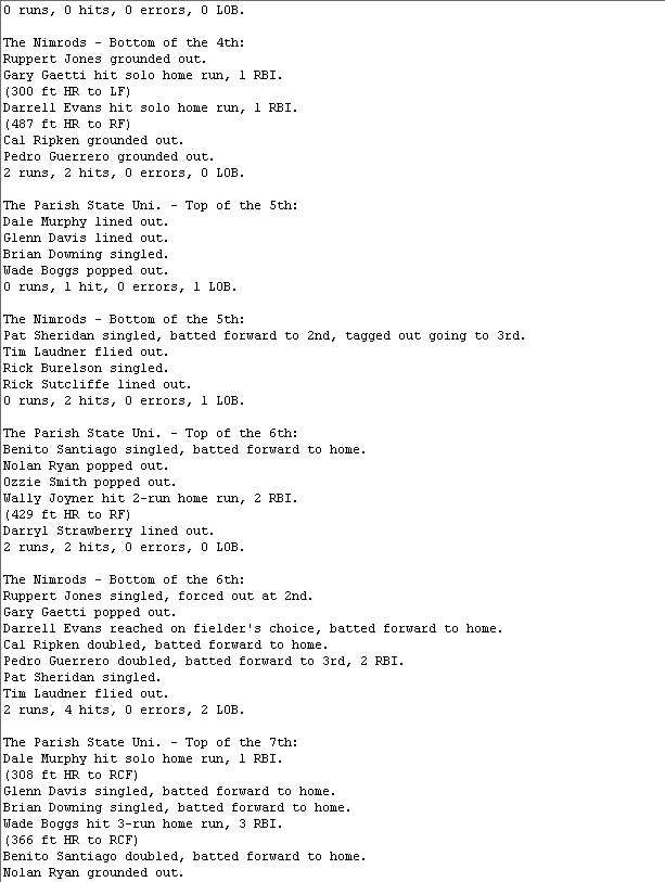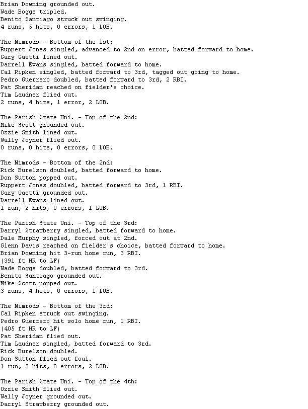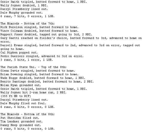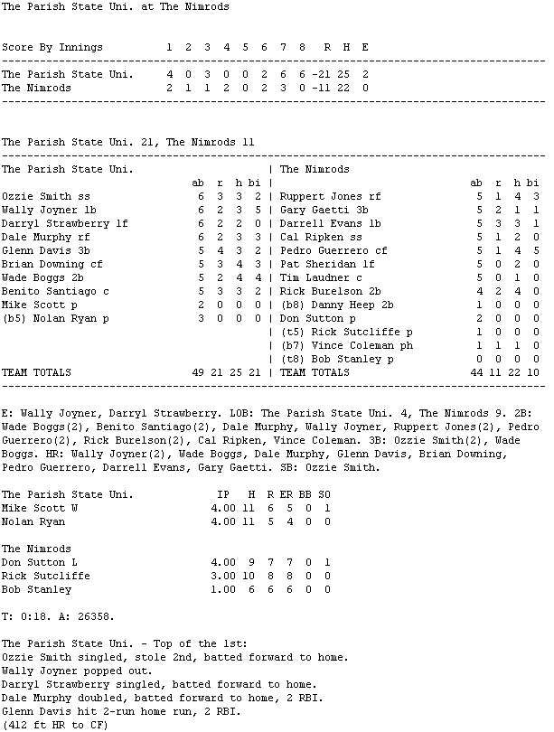 Wally Joyner had two home runs and five RBI for Parish State (4-5), while Ozzie Smith added a pair of doubles and a stolen base. Parish State jumped out to an early 4-0 lead and never trailed, despite having The Nimrods (3-6) close to lead to within one run on three different occasions.