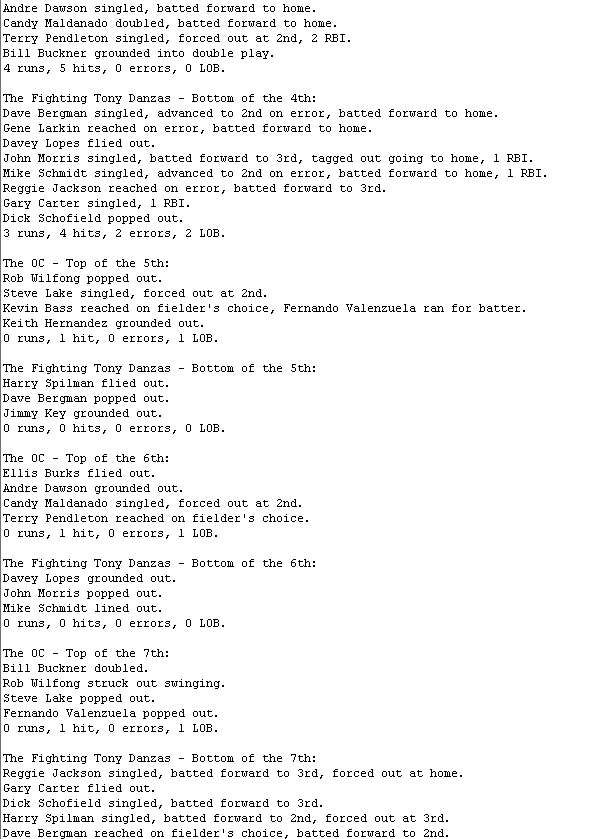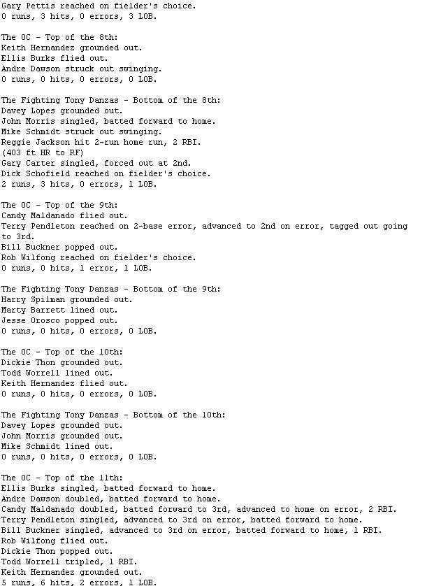 The OC (6-4) benefited from five errors committed by The Fighting Tony Danzas' (5-6) defense. Todd Worrell picked up the win by giving up one run over three innings.