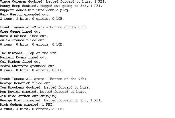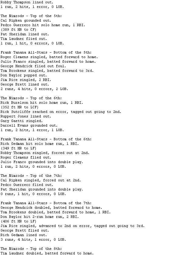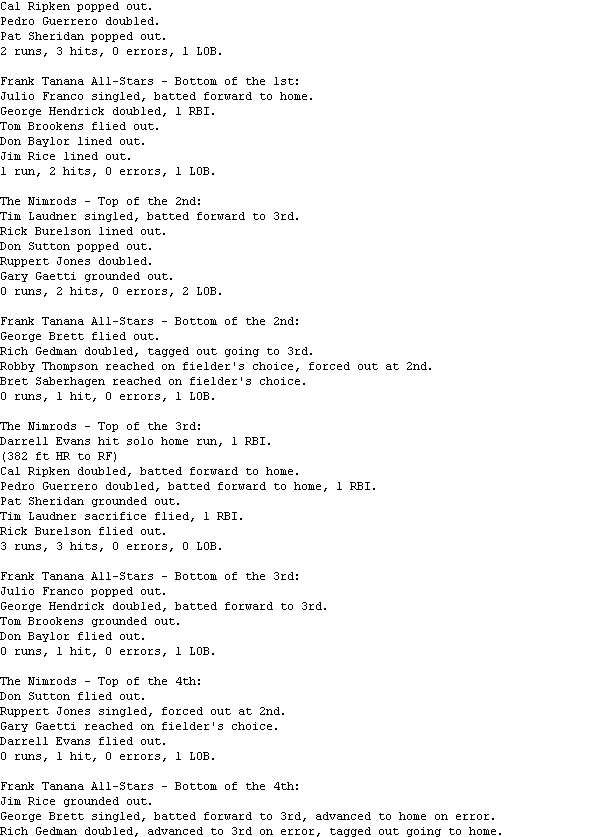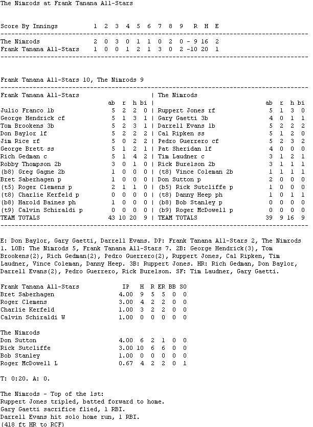 Gedman finished the day 4-for-5, including a home run. George Hendrick added three doubles for the Doverbi Division leading Frank Tanana All-Stars (7-3), who halted a two-game losing streak with the win.