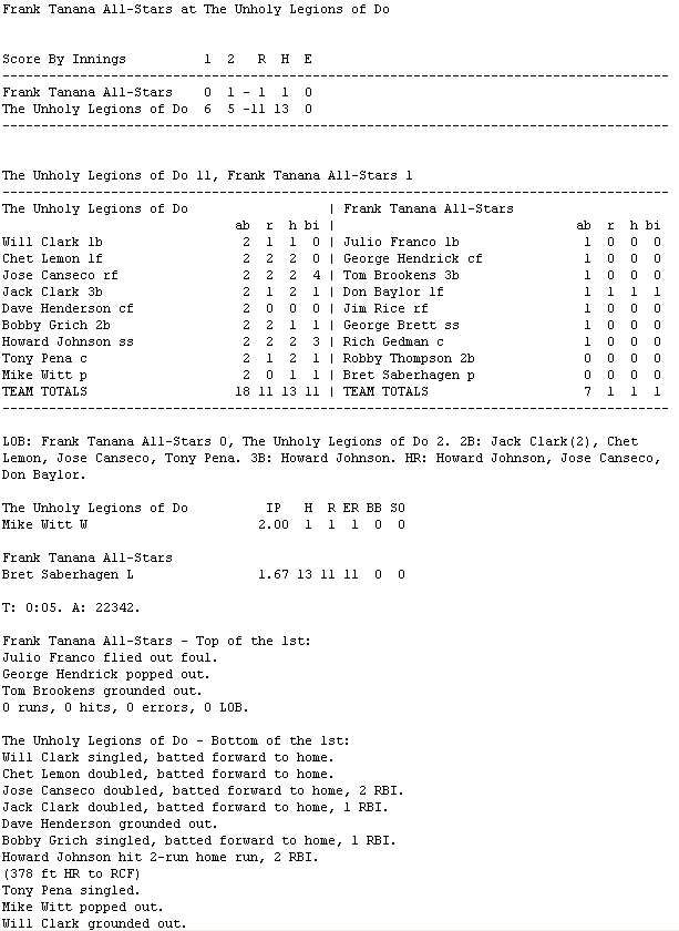 Mike Witt gave up only one hit over two innings to pick up the win for The Unholy Legions of Doom (6-7).