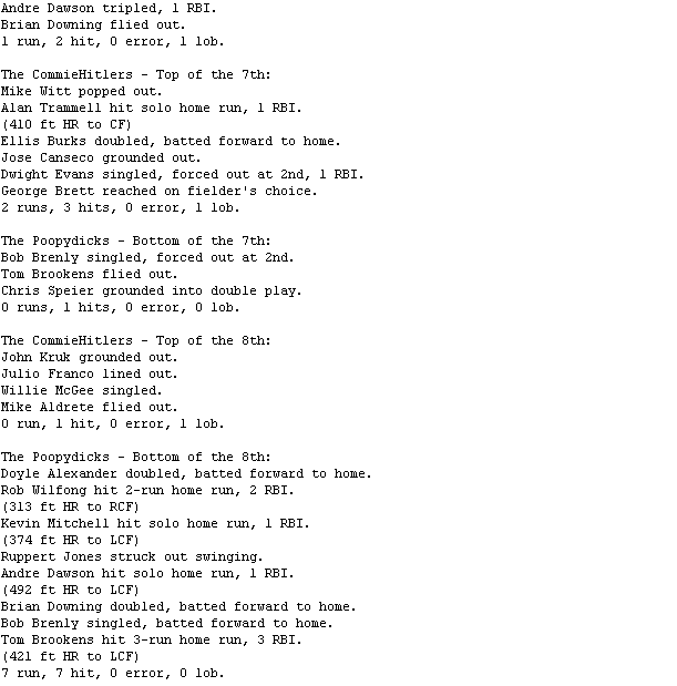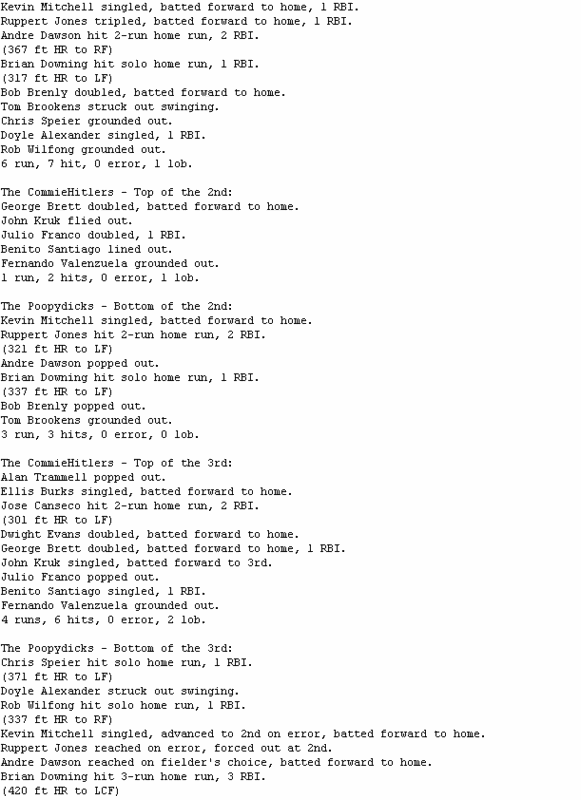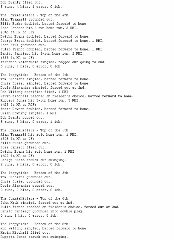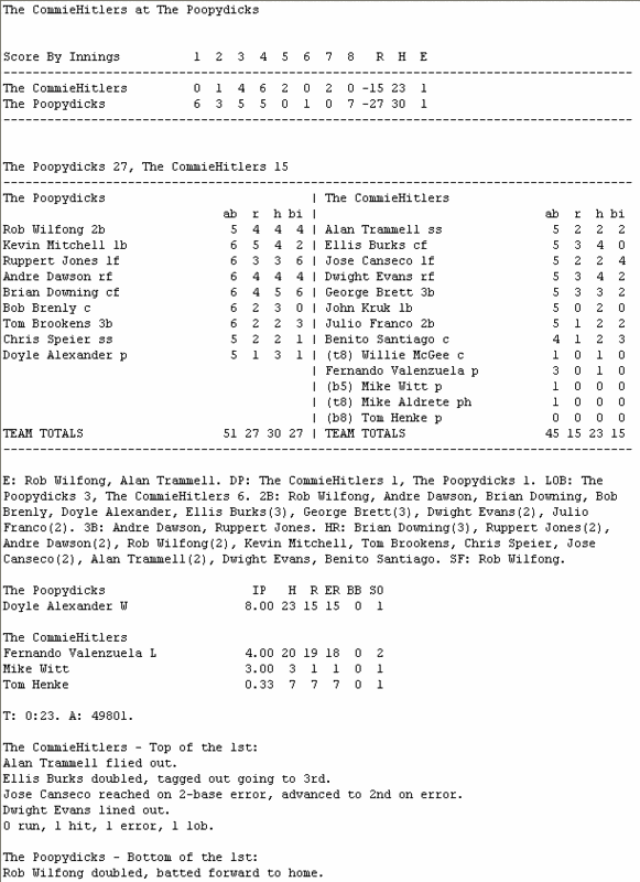 Ruppert Jones, Andre Dawson and Rob Wilfong all homered twice for The Poopydicks (5-0), who are in danger of running away with the Doverbi Division title. Jose Canseco and Alan Trammell each hit two home runs for The CommieHitlers in defeat.