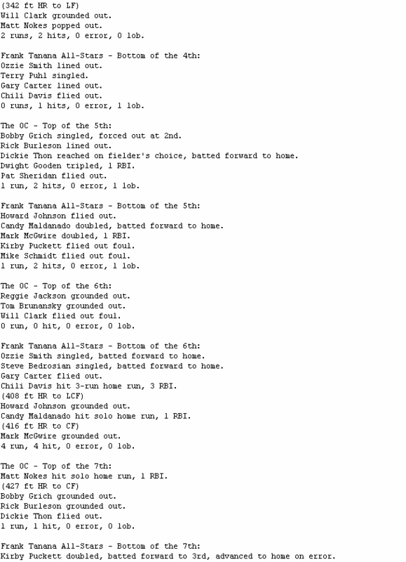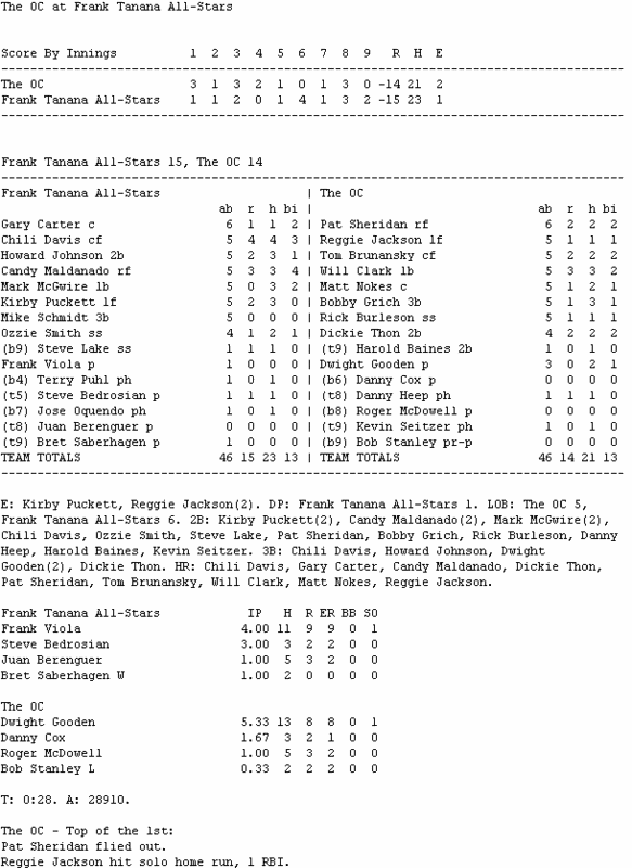 Chili Davis homered, scored four and drove in three as part of a 4-for-5 performance to pace the Frank Tanana All-Star's attack. Will Clark homered and collected three hits to lead The OC.