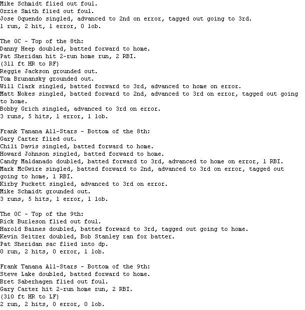 DEE NEE CITY - Gary Carter's two-run, walk off home run off of Bob Stanley gave The Frank Tanana All-Stars a dramatic 15-14 victory over The OC in a Fantasy RBI League game played Wednesday night at Tengen Stadium.