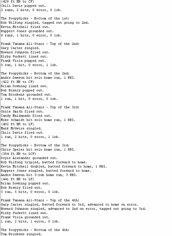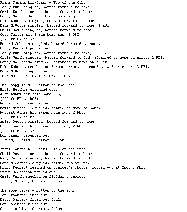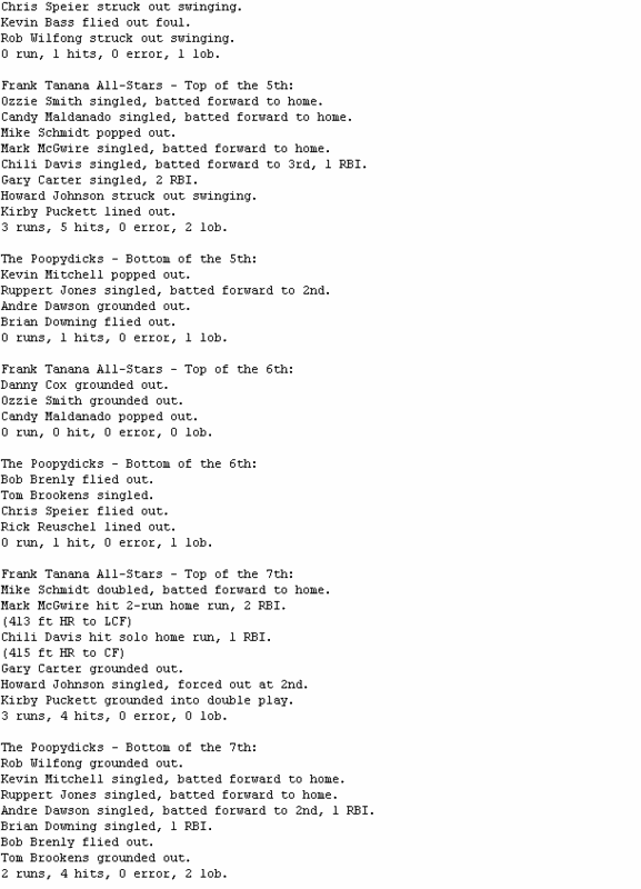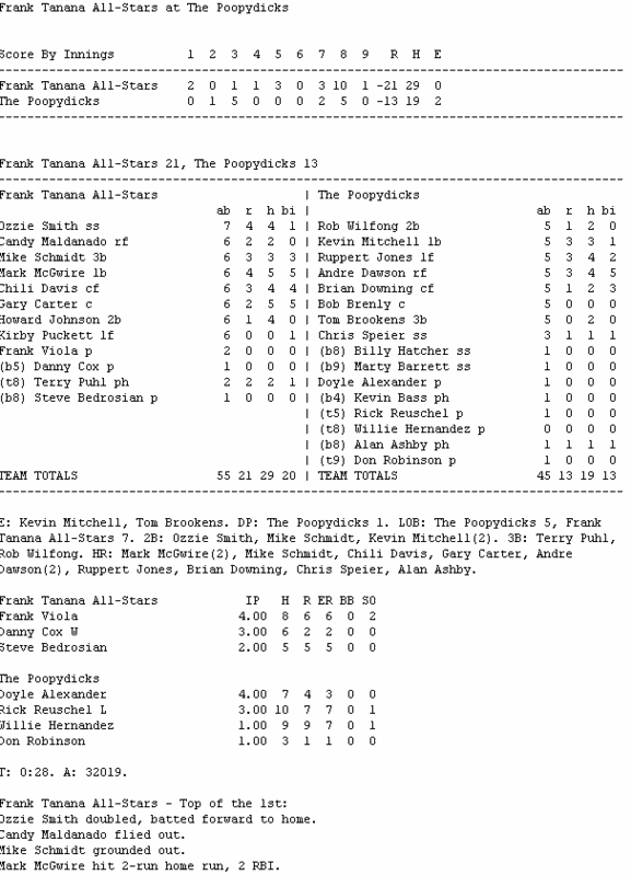 Mark McGwire homered twice and drove in five to pace The Frank Tanana All-Stars (3-4), while Gary Carter also drove in five. Andre Dawson's two home runs and five RBI were not enough for The Poopydicks (5-2) to overcome some terrible defense and another poor outing by their bullpen.
