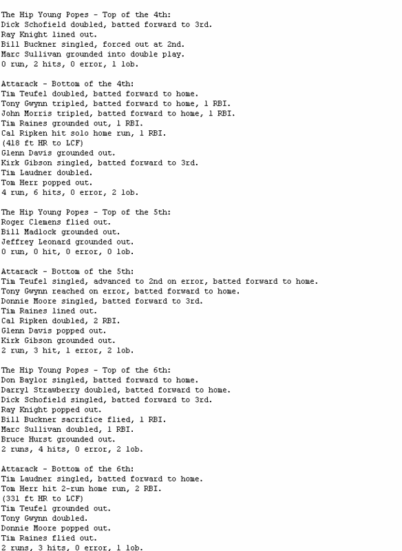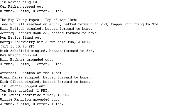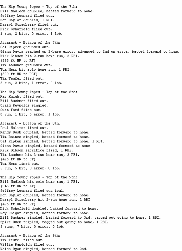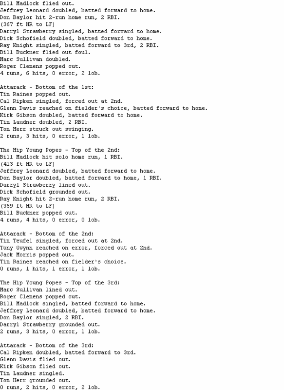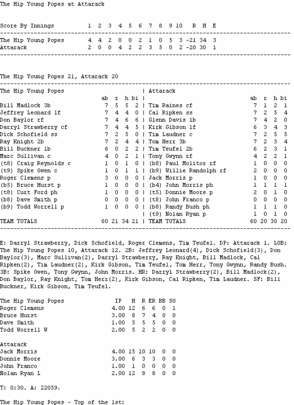 Attarack (3-4) closed to within one run in the bottom of the tenth, and had Tom Herr on second as the potential tying run with two outs before Todd Worrell was able to get Willie Randolph to ground out to preserve the win for The Hip Young Popes (3-4).