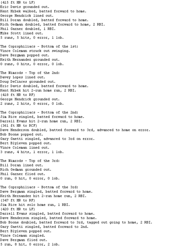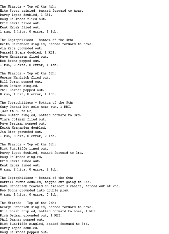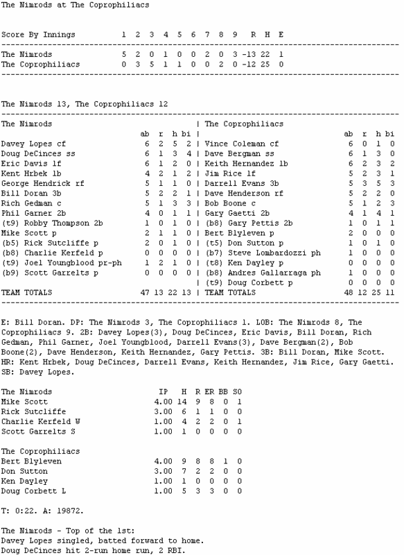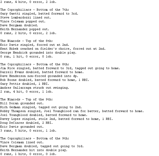 The Coprophiliacs (3-4) had a chance to tie or win in the bottom of the ninth, after Dave Bergman doubled with one out. But Scott Garrelts was able to get Keith Hernandez to line out to short and double up Bergman for the game-saving double play for The Nimrods (3-4).